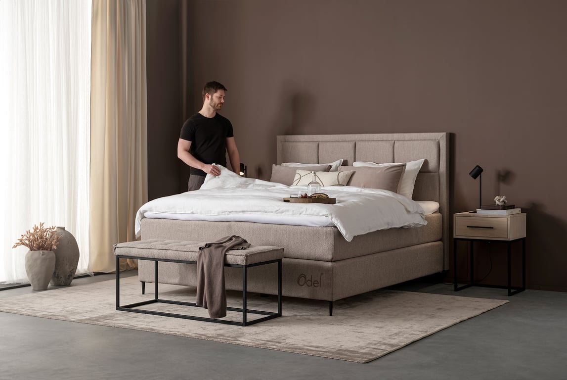 Odel® Foss kontinentalseng 140x200Tekstil Dovre koks, 4 valgmuligheter i vendbar liggekomfort, inkludert Odel 35 overmadrass og sengeben