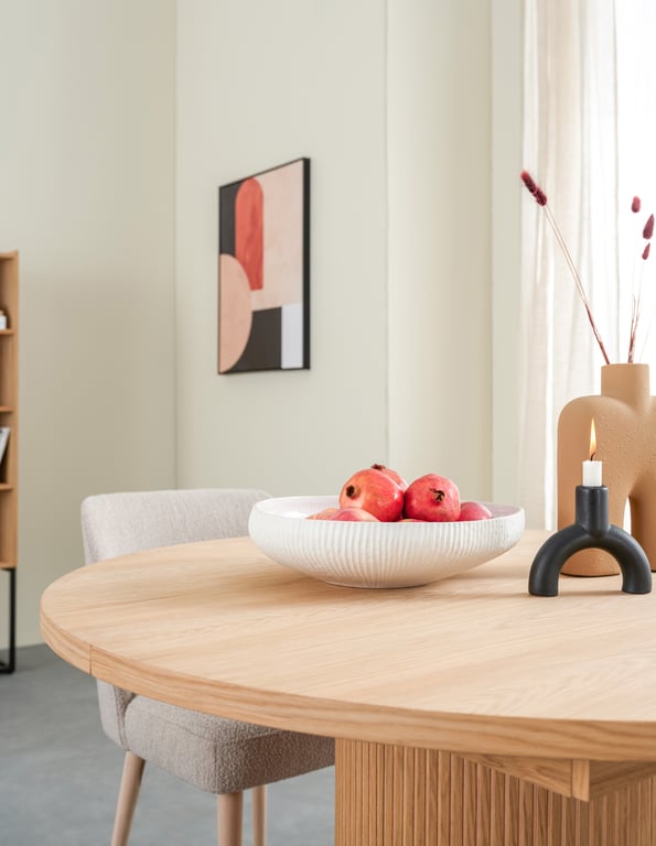 Linea spisebord er tilgjengelig i to størrelser, med en diameter på enten 120 cm eller 138 cm. Bordet har en praktisk metalluttrekksmekanisme som gjør det enkelt å forlenge bordet når du trenger ekstra plass. Begge størrelsene har plass til 4 ileggsplater, hver med en bredde på 45 cm. Bordet er laget av finert eik, noe som gir en naturlig og holdbar overflate. Kommer i flere trefarger og to typer understell. Støttebein anbefales ved uttrekk av 3 eller 4 plater.