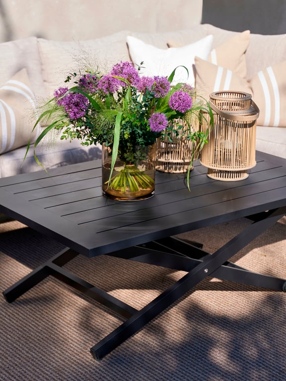 Et flerbruksbord med trinnløs regulering slik at det kan brukes både som spisebord og sofabord. Høyden justeres enkelt med håndtak under bordplaten. Hjul på ene siden gjør bevegelsen smidig, samtidig som bordet enkelt kan flyttes. Bordet er laget i aluminium som er perfekt til utendørsbruk som hagemøbel.