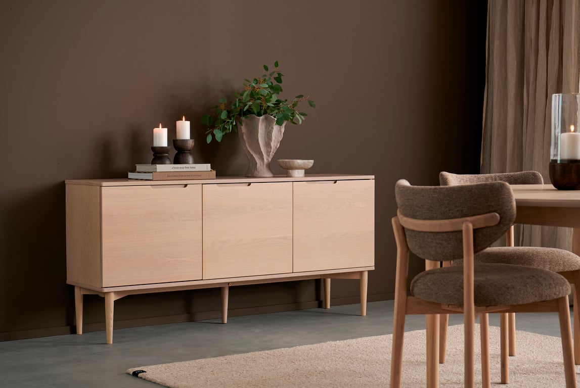 Karmøy skjenk er et elegant og tidløst oppbevaringsmøbel som kombinerer form og funksjon. Med tre skuffer og to skapdører får du en praktisk oppbevaringsløsning som fungerer i både stue – og spisestue.