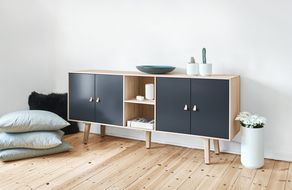 Skjenken i serien Square Exclusive er laget av 16 mm tykk eik heltre mørk røkt, med fingerskjøtede hjørner og tre ben. Dørene i skjenken har soft close, som resulterer i en stille lukking.