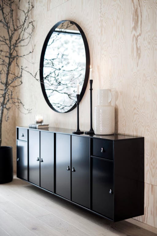 Oppgrader stuen din med den stilige og funksjonelle Holstebro skjenk! Med tre dører og tre skuffer gir denne skjenken deg rikelig med oppbevaringsplass til å organisere alt fra servise til bordbrikker og duker.