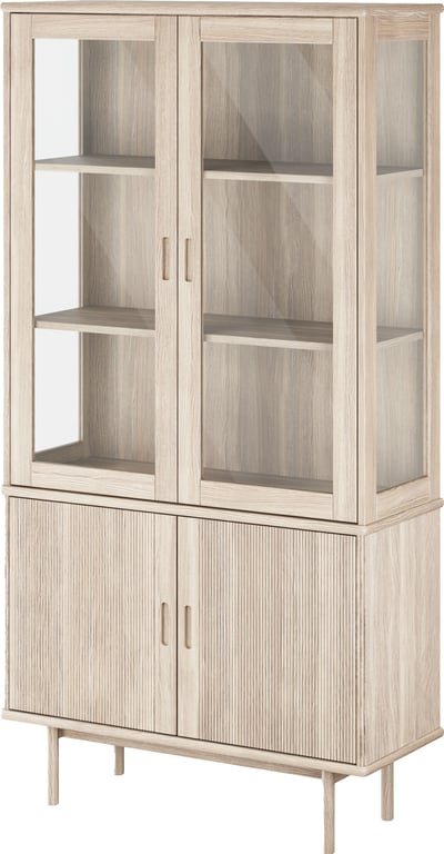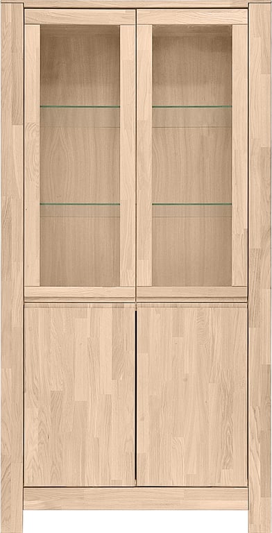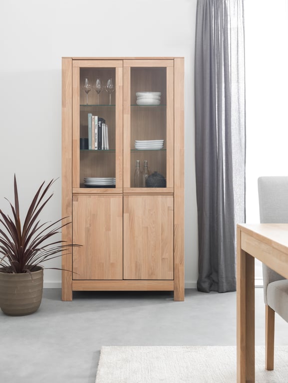 Square vitrineskap er laget av massiv eik i mørk røykfarge. I tillegg til de 6 skuffene med softclose, får du også 3 glasshyller og ledlys installert i vitrineskapet.
