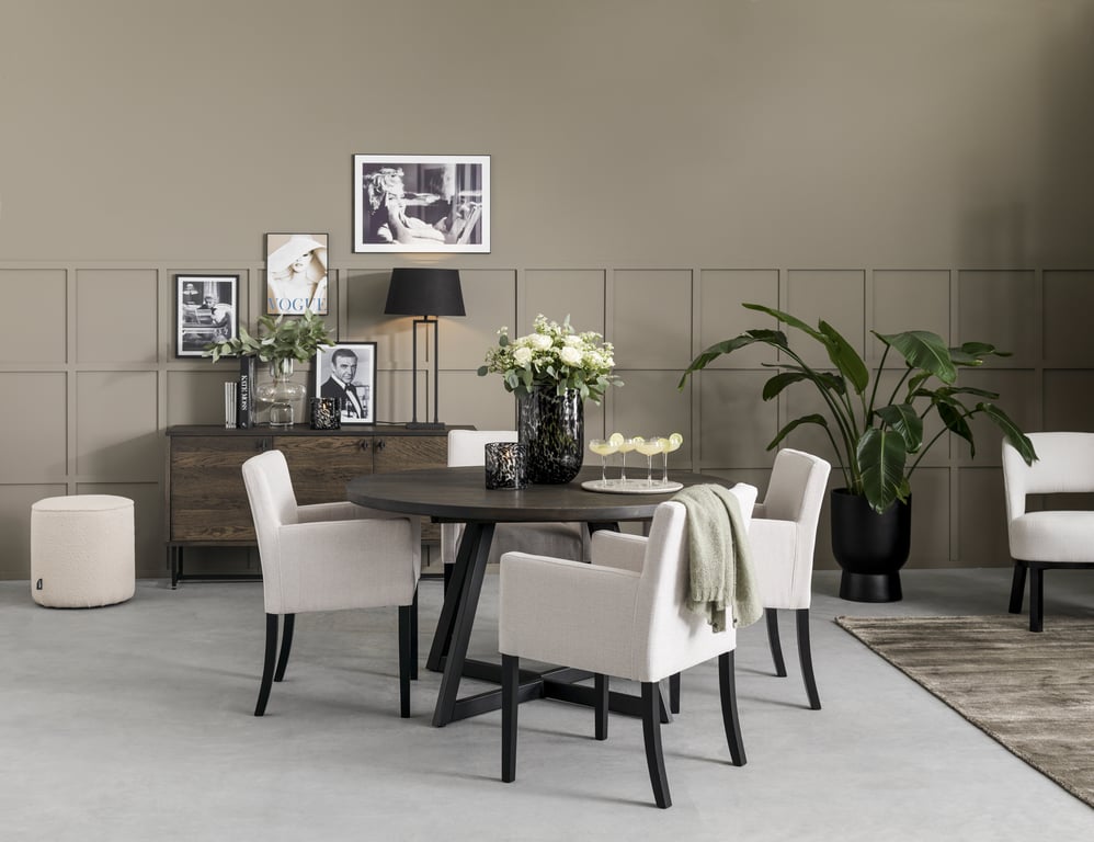 Embla rundt spisebord kombinerer solid håndverk med moderne design. Den runde formen skaper en sosial og innbydende spiseplass, mens det markante metallunderstellet gir et tøft og tidsriktig uttrykk.