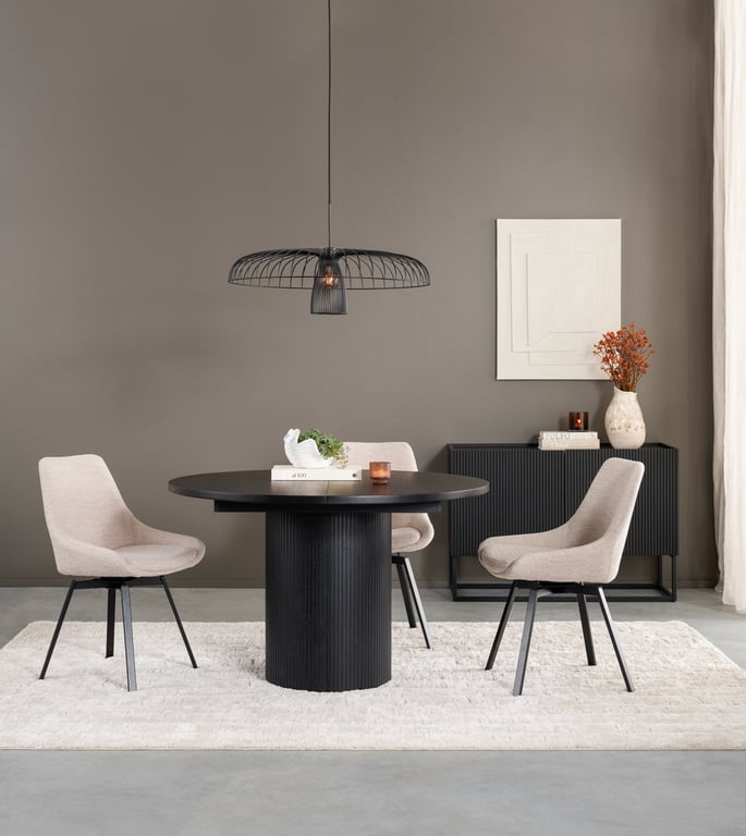 Nora spisestol tilbyr både stil og funksjonalitet. Den kommer med praktisk svingfunksjon som gjør det enklere å komme til og fra spisebordet. Den er tilgjengelig i to forskjellige farger og utførelser. Denne har stoffet Alpine beige med svarte ben. Understellet er laget av pulverlakkert stål, som gir både stabilitet og stil. Med en Martindale-slitasjetest på 100 000, er Nora spisestol solid og holdbar. Den tåler daglig bruk og er designet for å opprettholde kvalitet og utseende over tid.