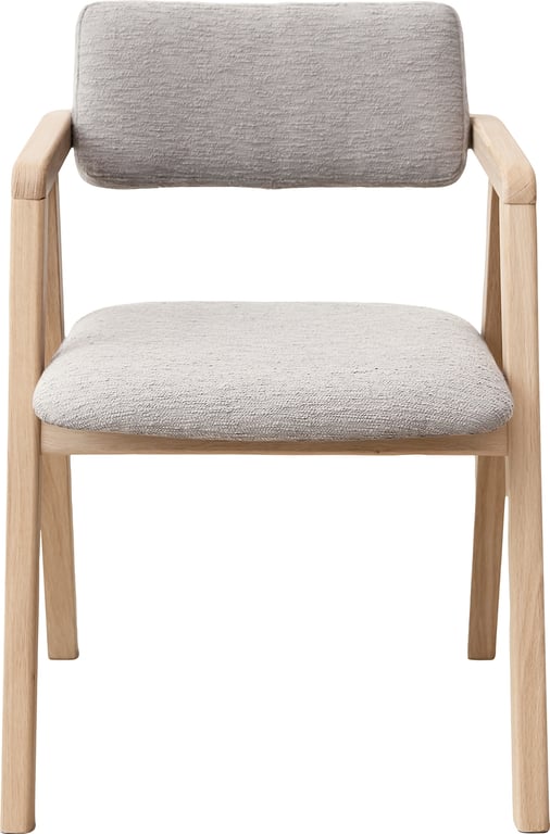 Aron spisestol kombinerer klassisk stil og komfort i ett. Den har en hvitoljet heltre eik ramme og et sete kledd i en vakker beige boucle, som gir stolen et elegant og tidløst utseende.