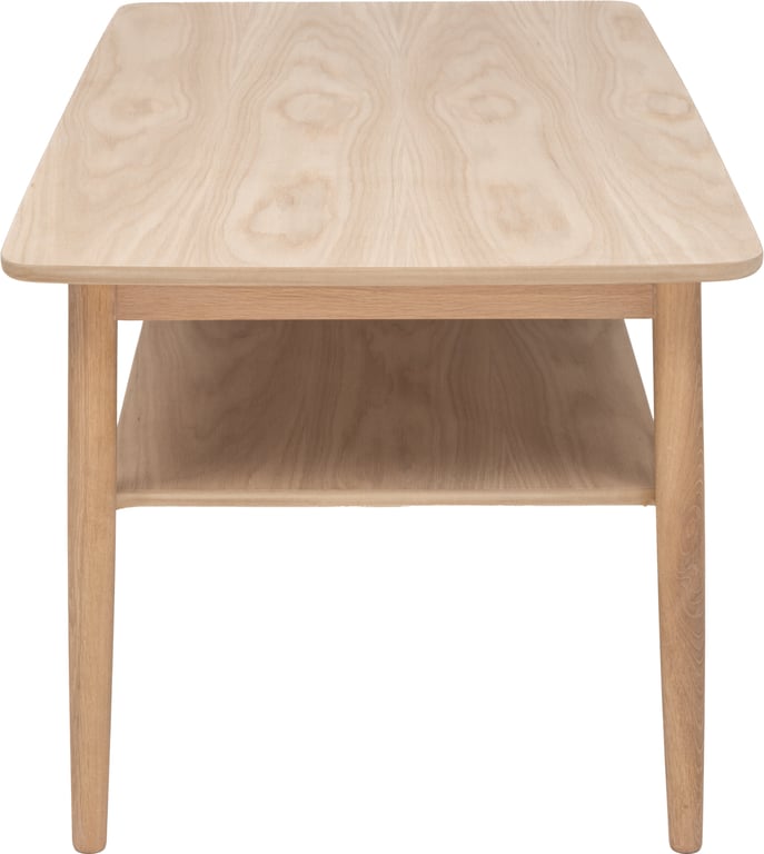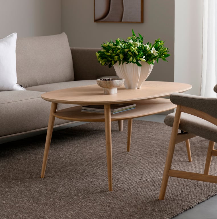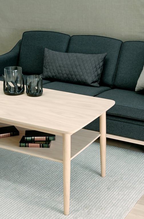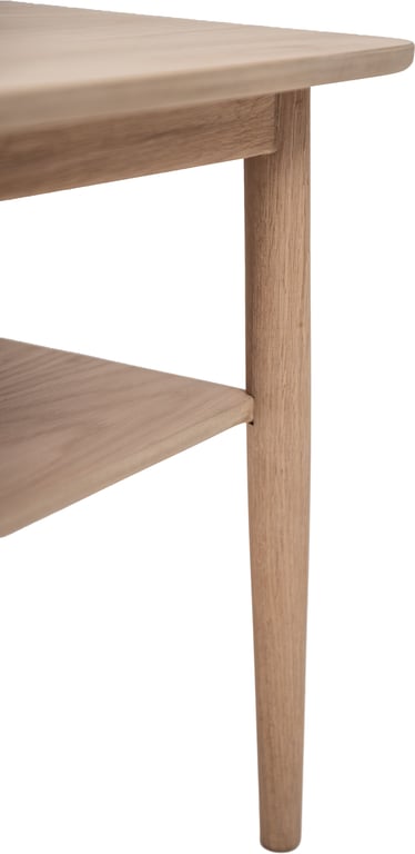 Dette sofabordet er et elegant sofabord i nordisk stil med oppbevaringsplass, som gir både stil og praktisk bruk i hverdagen. Den ekstra høyden på 57 cm gjør bordet perfekt for deg som ønsker en mer komfortabel sittestilling når du spiser, jobber eller nyter en kopp kaffe i sofaen. Bordplaten er laget av finert eik, som gir en naturlig og lun overflate. Sofabordet er tilgjengelig i tre fargevarianter: hvitpigmentert, mocca og eik finert lakkert. Norskprodusert og designet av Kleppe – solid, stabilt og med tidløst design som varer.