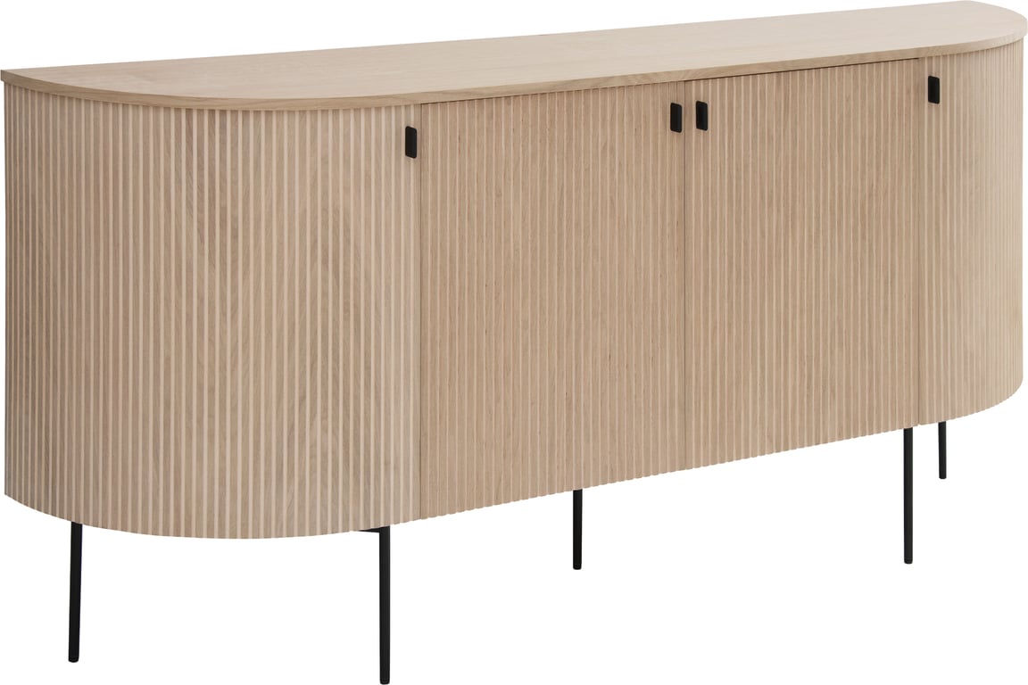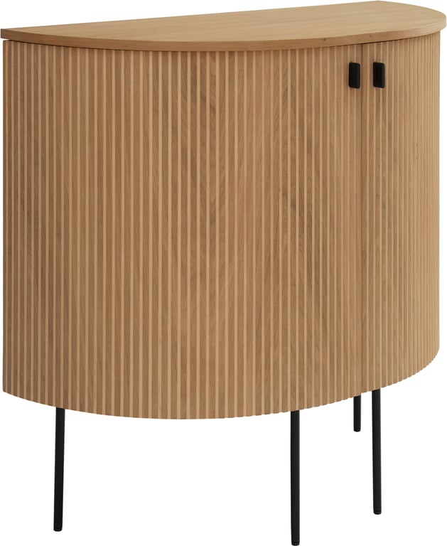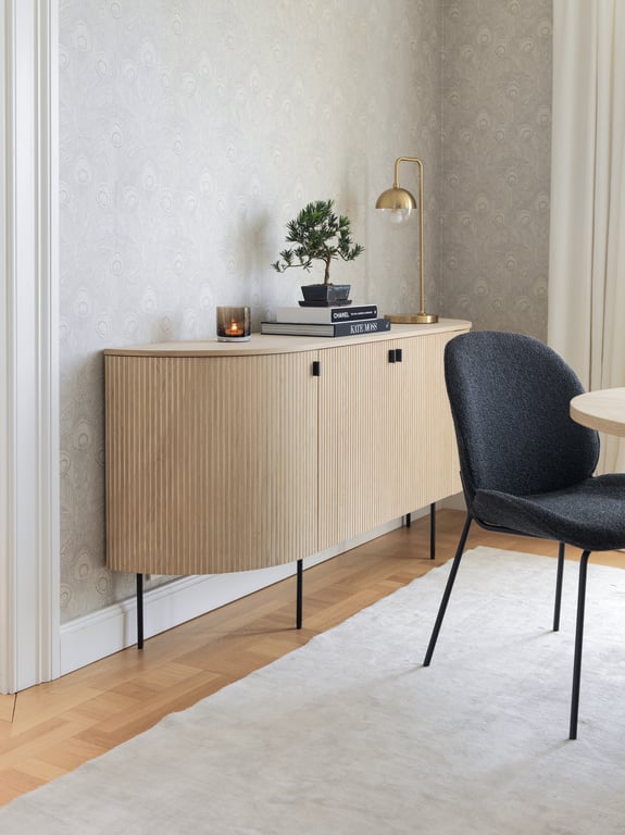 Linea buet høy skjenk er en ferdigmontert høy skjenk med 2 dører som har softclose-funksjon. I midtseksjonen har den en åpen løsning med trehyller. Skjenken har svarte metallbein med høydejustering, som gir stabilitet og tilpasningsmuligheter. Den er tilgjengelig i alle farger og finisher, slik at du kan velge den som passer best til din stil og innredning. Felles for Linea serien er dens bruk av nydelige spiler på møblene.
