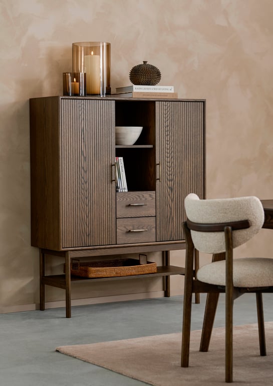 Stilrent vitrineskap med god høyde og bredde. Det brunlakkede eikefineret gir et elegant og varmt uttrykk – ideelt for å vise frem dine fineste glass og pyntegjenstander.