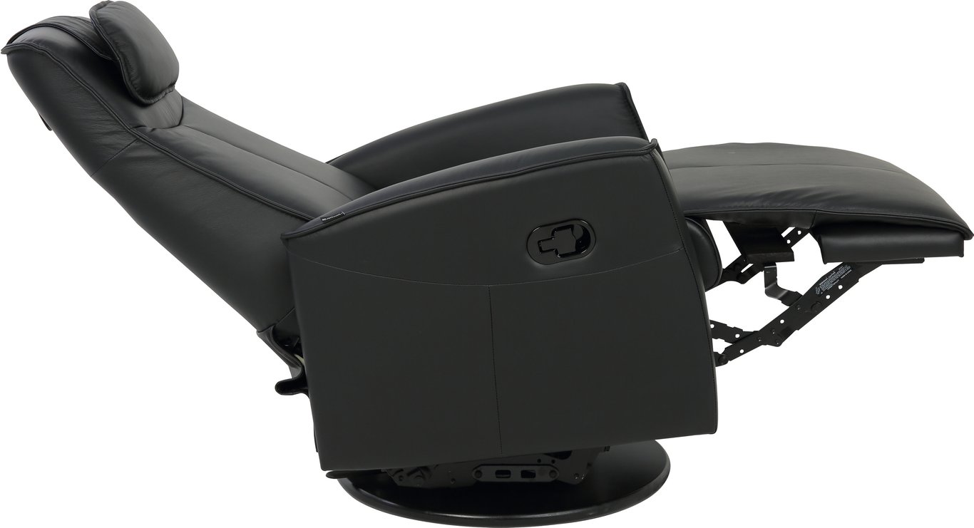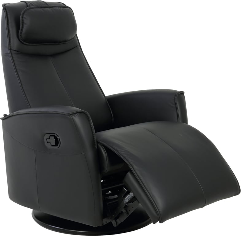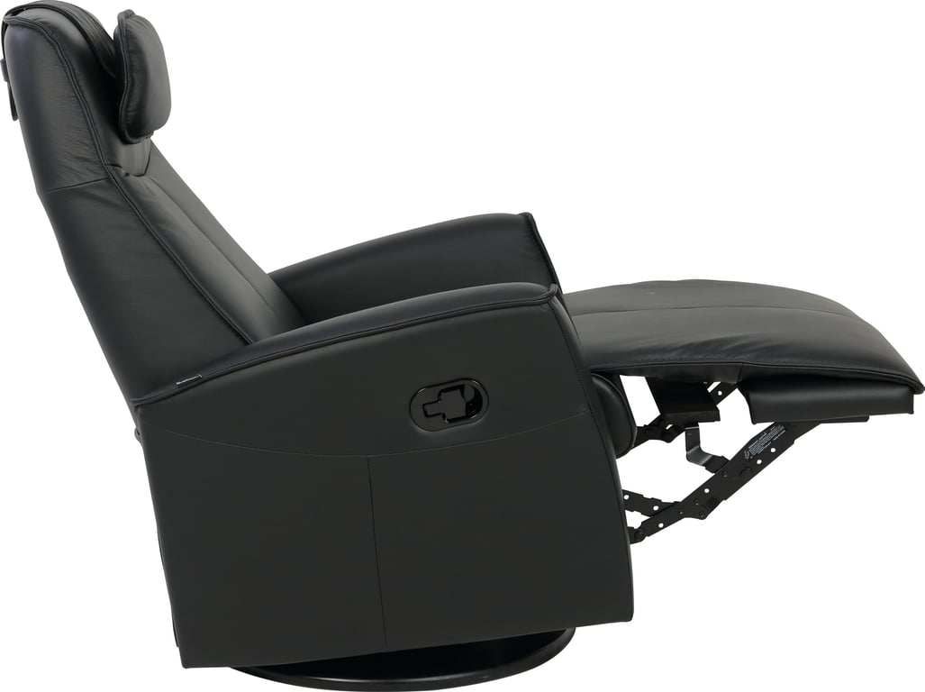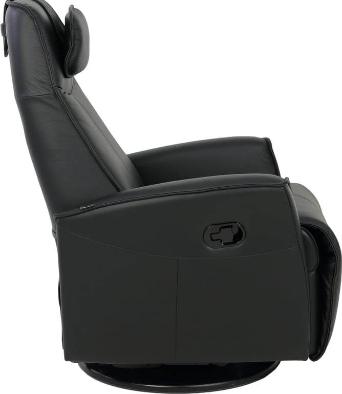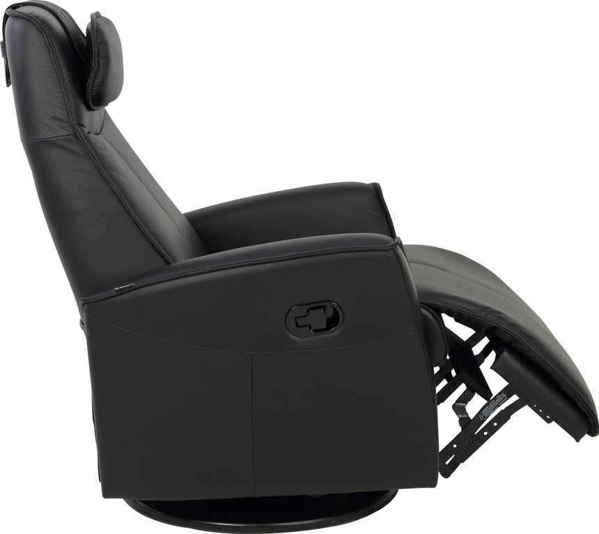 Komfortabel, plassbesparende manuell recliner som kombinerer stilrent design med maksimal komfort. Den har integrert fothviler, sving- og gyngefunksjon der gyngefunksjonen enkelt kan låses ved hjelp av en spak på baksiden av stolen. Justerbar nakkestøtte og avtagbar nakkepute gir personlig tilpasning, mens ergonomisk utforming og førsteklasses materialer gjør stolen ideell for avslapning i hverdagen.