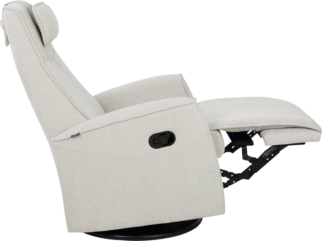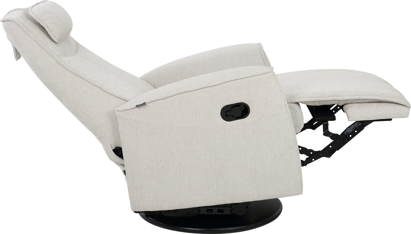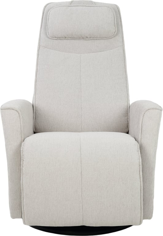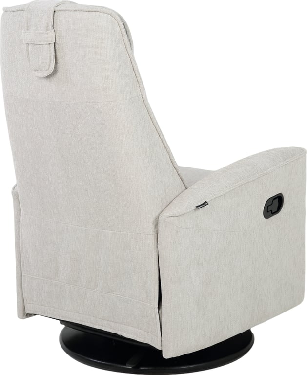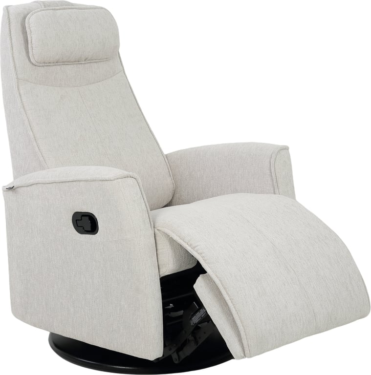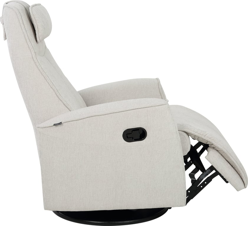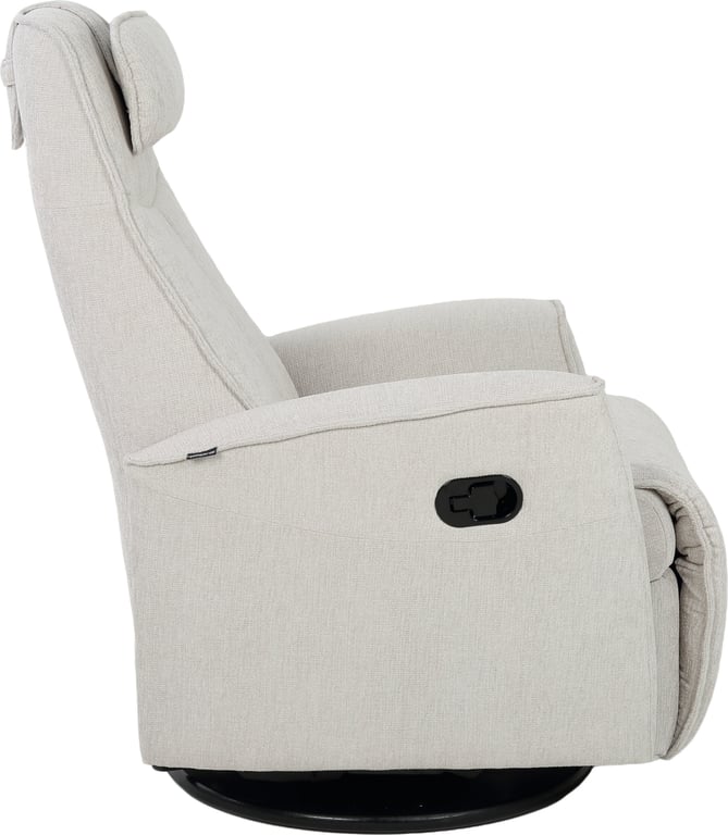 Komfortabel, plassbesparende manuell recliner som kombinerer stilrent design med maksimal komfort. Den har integrert fothviler, sving- og gyngefunksjon der gyngefunksjonen enkelt kan låses ved hjelp av en spak på baksiden av stolen. Justerbar nakkestøtte og avtagbar nakkepute gir personlig tilpasning, mens ergonomisk utforming og førsteklasses materialer gjør stolen ideell for avslapning i hverdagen.