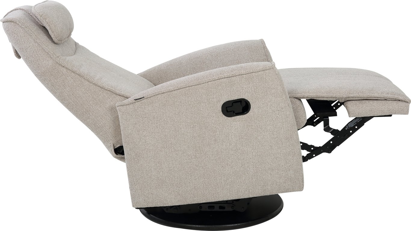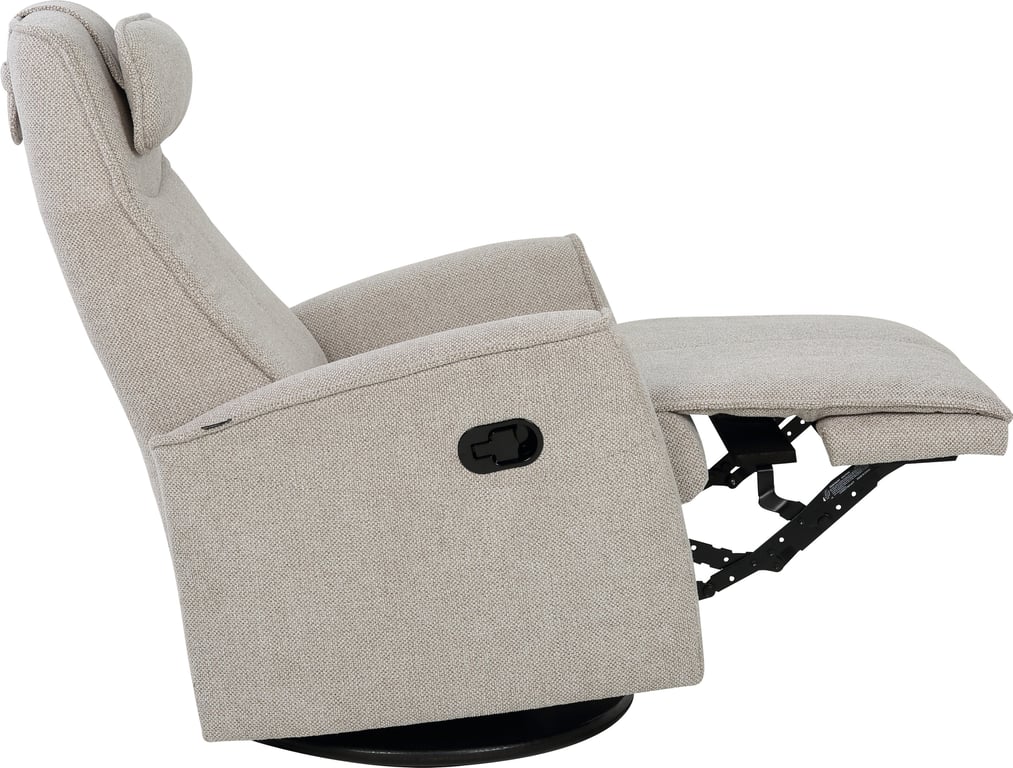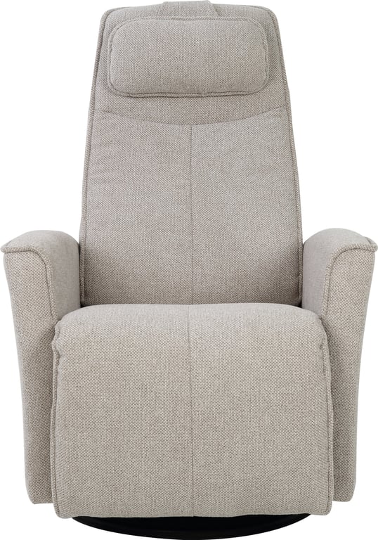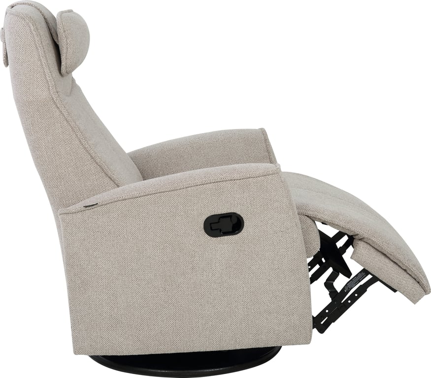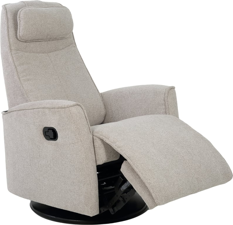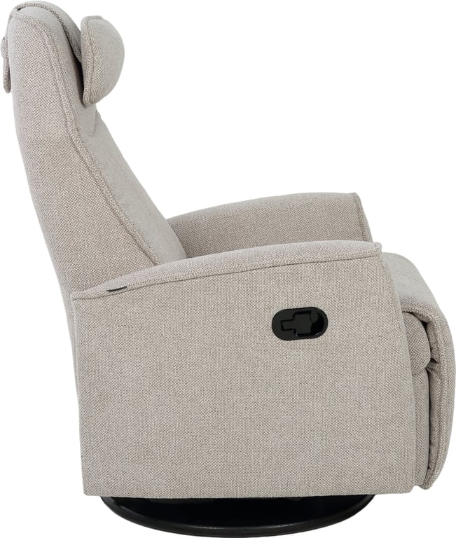 Komfortabel, plassbesparende manuell recliner som kombinerer stilrent design med maksimal komfort. Den har integrert fothviler, sving- og gyngefunksjon der gyngefunksjonen enkelt kan låses ved hjelp av en spak på baksiden av stolen. Justerbar nakkestøtte og avtagbar nakkepute gir personlig tilpasning, mens ergonomisk utforming og førsteklasses materialer gjør stolen ideell for avslapning i hverdagen.