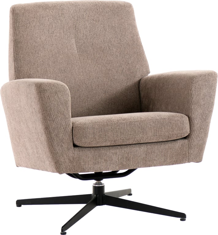 Den kan leveres både med og uten regulering av ryggdelen. Tekstilet er Mino i fargen liver. Den dreibare sokkelen er sortlakkert, men kan også leveres i matt grå utførelse. Brunstad Choice loungestol finnes også i en høyrygget utgave som hvilestol med regulering av både rygg og nakkedel.