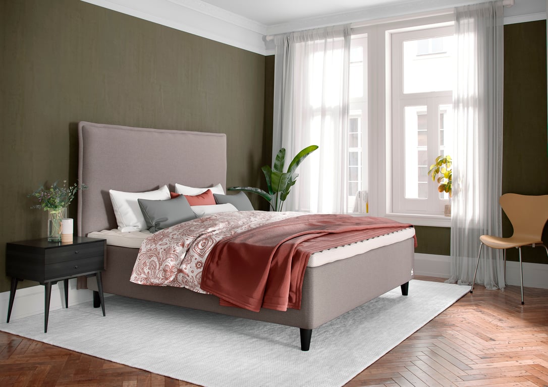 B 180 cm H 115 cm Stoff Moment midnight. Må stå mellom seng og vegg. Ben inkludert.